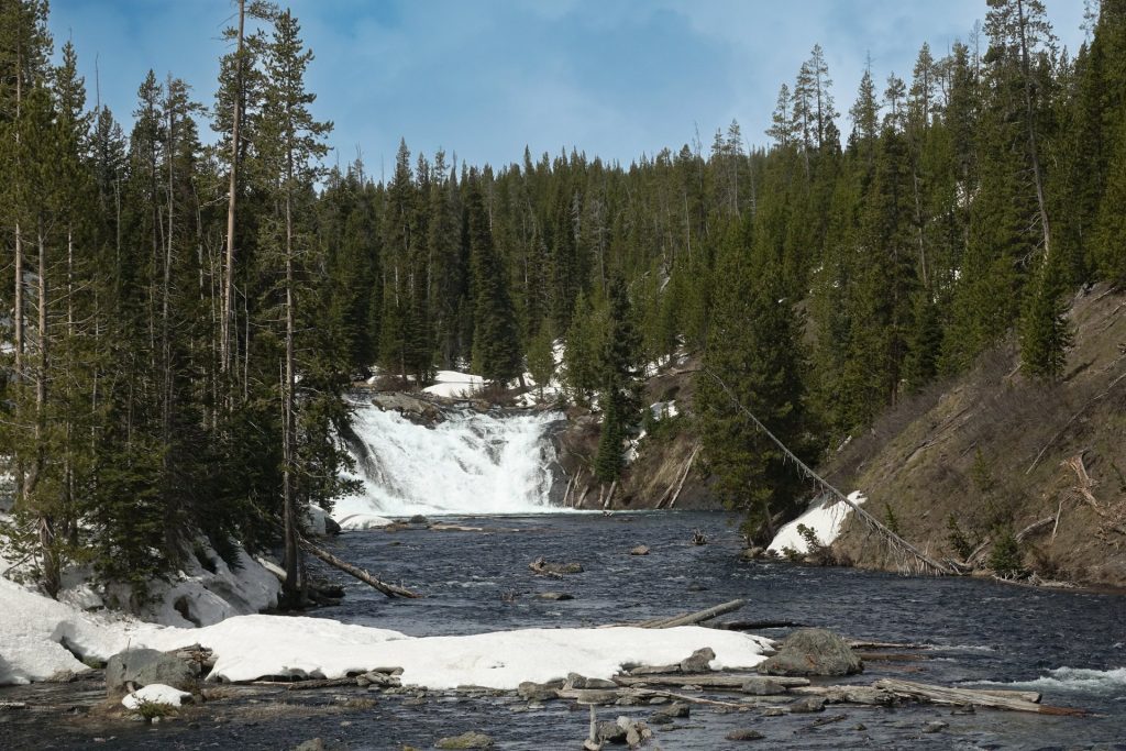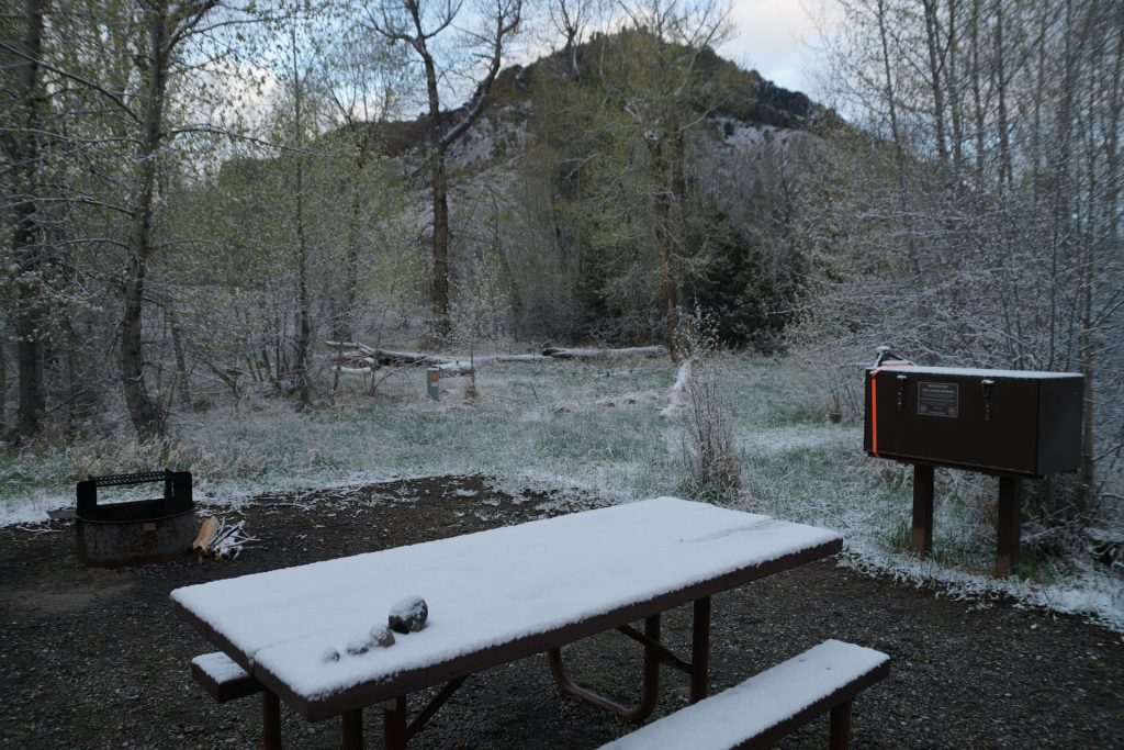 On the way from Grand Teton to Yellowstone National ParkOur campground is a few miles east of the East Entrance – on the way to Cody.Our campsite… well – in the morning it looks super beautiful 🙂The campsite from our friendsThe campfire will keep us warm.. and the dinner is ready soon!Again – lots of waring signs in the park!Lake YellowstoneLewis FallsKepler CascadesLake Yellowstone frozen ….… and beautifullOne of the main attractions in the parkOld Faithful Geyser is in action – about every 2 hours. At our “show” he produced a lot of smoke – because of the cold weather.