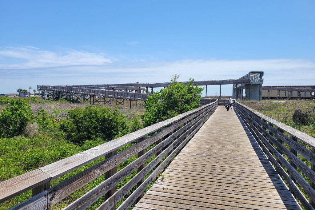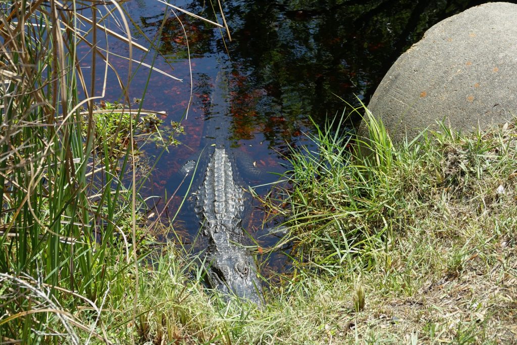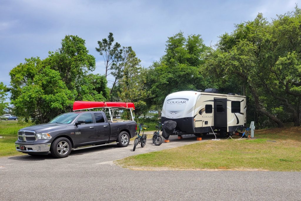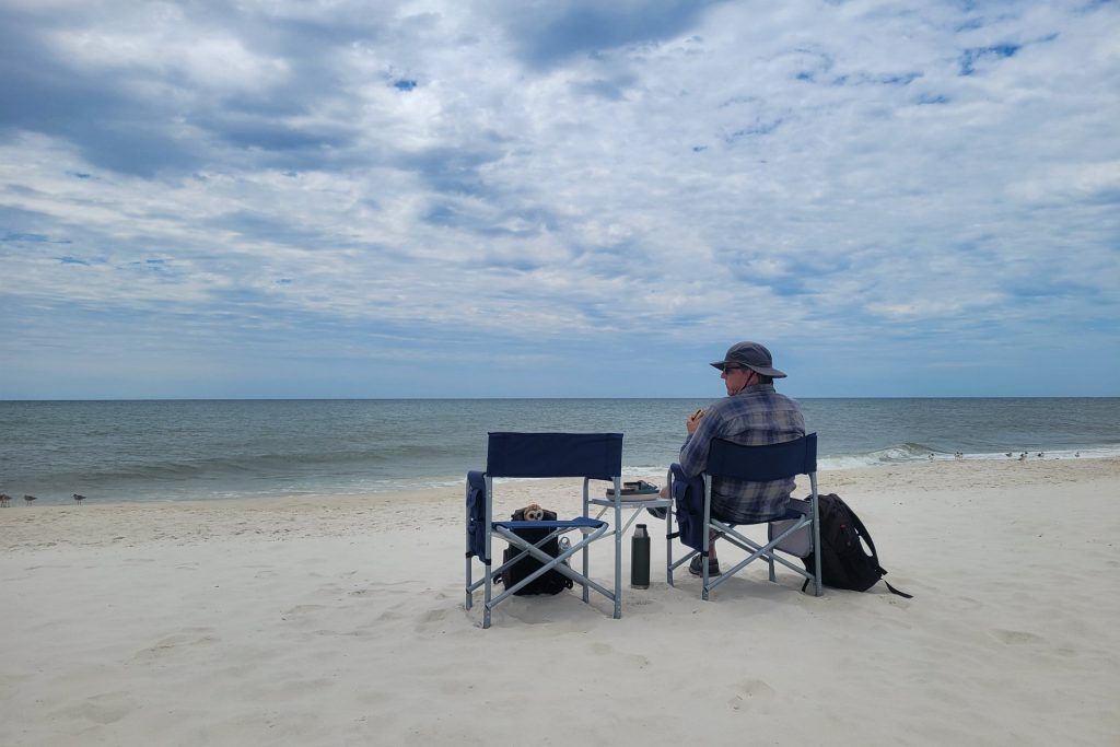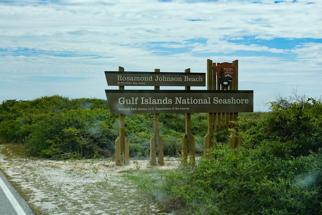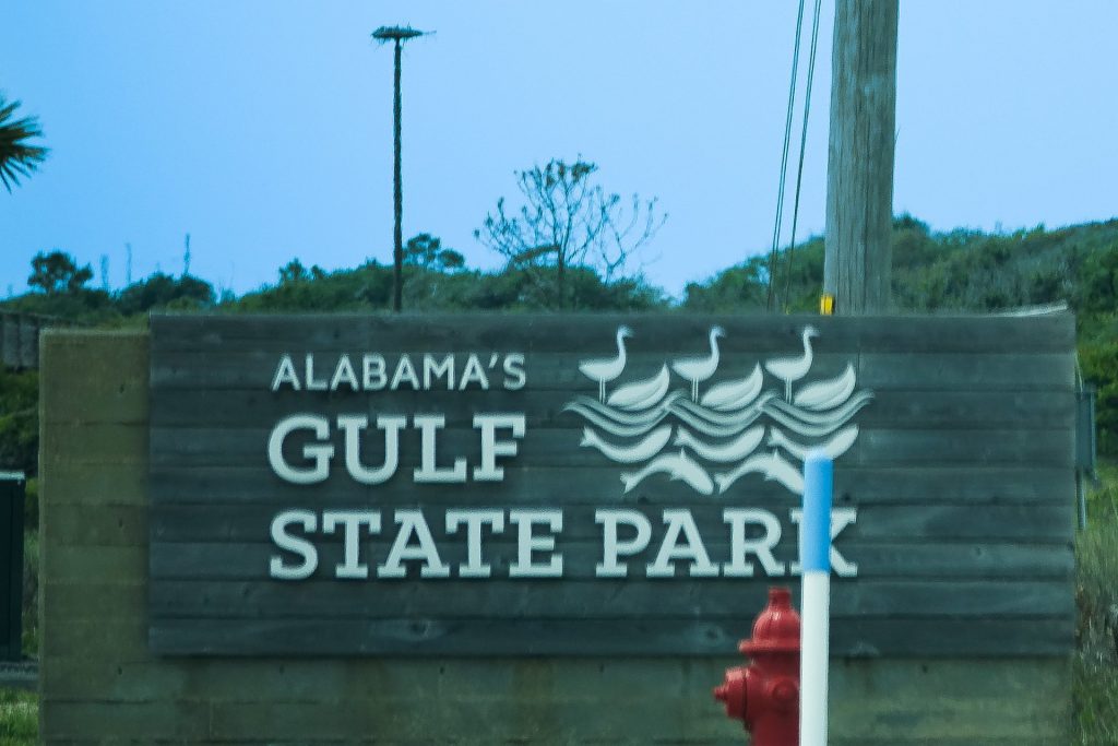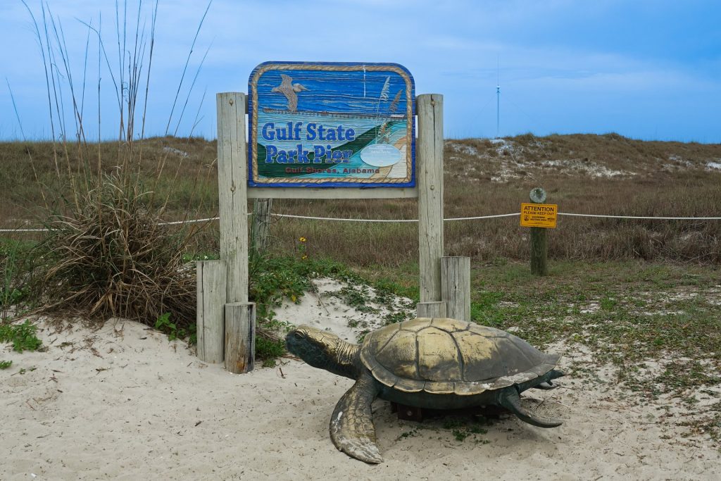 Again a super nice lakefront campsite.We walk the lake loop trail …… just beautiful ….… and from the other side of the lake having a view to our camper.Perfect site for sunset and campfire.On the way to the next campground … Aldi Shopping Stop – ooooh this one with self check out !!!!Also on the way to the next we stop at Gulf Island National Seashore.Nice stop for a “Lunch break” 🙂Arriving in Alabamaand the next stop is Gulf State Park – a very nice and very large Resort Style Campground.Our CampsiteAnd 40 Miles of trails in the park – almost all are bike friendly.Also part of the State Park is what used to be the longest Pier in the Gulf.… with serious fishing going on !!!Oh yes … the beaches are on the other side of the highway – so nice overpass gets you over there.Nice beachesAnd “Lefty” – she got her name because she is missing her right paw …We have been at the little local museum before ….… and had to stop again – as it’s very interesting.