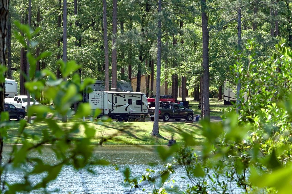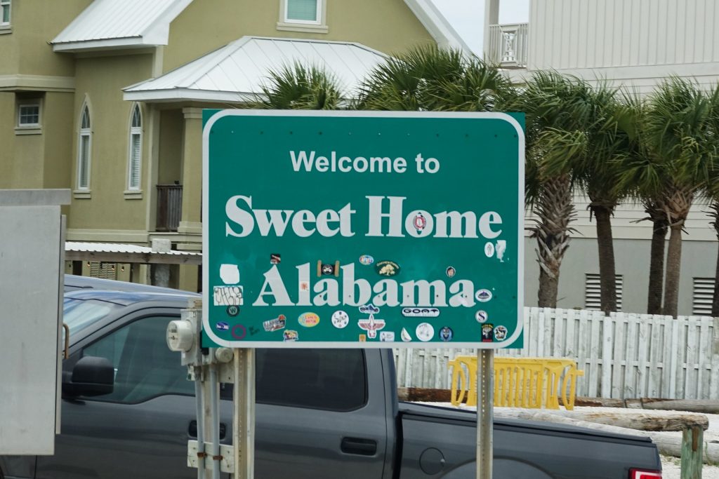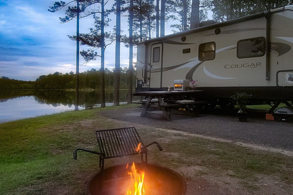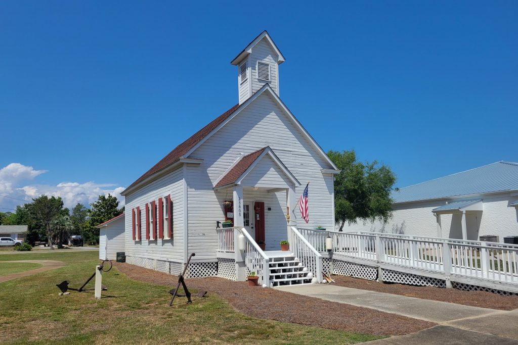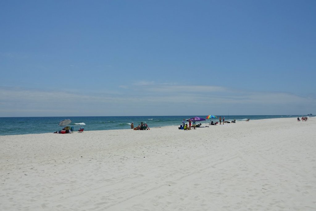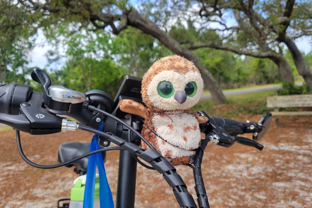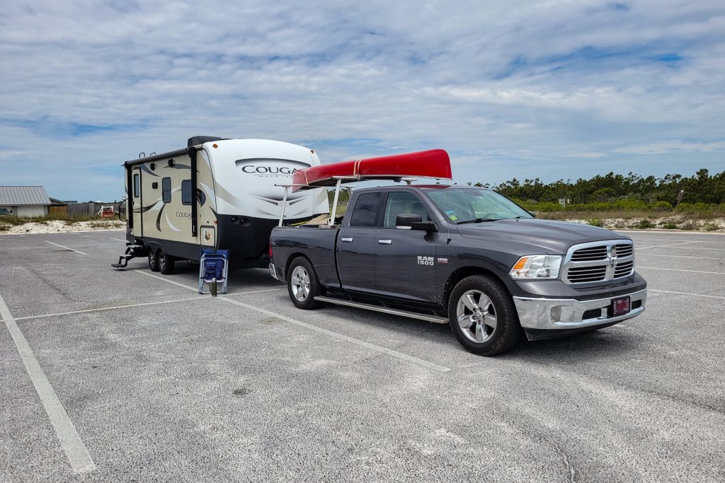 Again a super nice lakefront campsite.We walk the lake loop trail …… just beautiful ….… and from the other side of the lake having a view to our camper.Perfect site for sunset and campfire.On the way to the next campground … Aldi Shopping Stop – ooooh this one with self check out !!!!Also on the way to the next we stop at Gulf Island National Seashore.Nice stop for a “Lunch break” 🙂Arriving in Alabamaand the next stop is Gulf State Park – a very nice and very large Resort Style Campground.Our CampsiteAnd 40 Miles of trails in the park – almost all are bike friendly.Also part of the State Park is what used to be the longest Pier in the Gulf.… with serious fishing going on !!!Oh yes … the beaches are on the other side of the highway – so nice overpass gets you over there.Nice beachesAnd “Lefty” – she got her name because she is missing her right paw …We have been at the little local museum before ….… and had to stop again – as it’s very interesting.